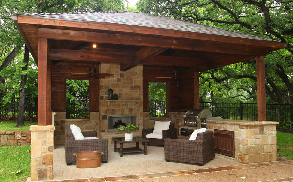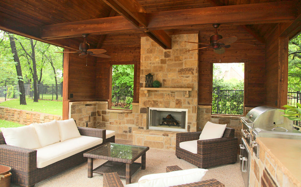The owner of this beautiful home nestled on a wooded lot wanted to create an outdoor kitchen and cabana that felt like a retreat. The cedar beams, fireplace and custom stonework help to create a rustic yet luxurious feel to the cabana. The large cutout openings in this cabana facilitate greater air flow and do a wonderful job of framing the gorgeous trees on the property. We also added a spa to the existing pool to create the perfect backyard resort!